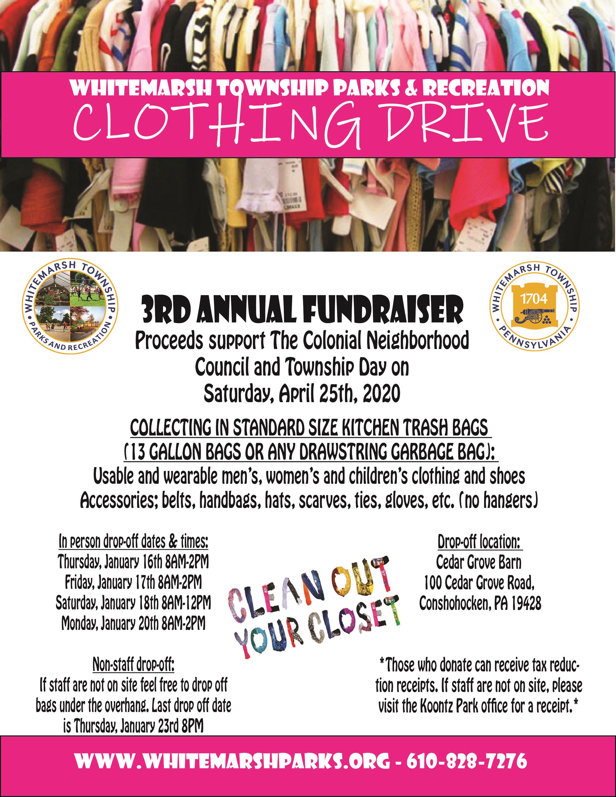 This event is the perfect opportunity to purge the clothes, shoes, & other accessories that you no longer need, but still have some life left in them! We'll be collecting usable men's, women's, & children's clothing and shoes, as well as belts, handbags, hats, scarves, ties, gloves, coats, and other similar accessories. Donated items should be placed in standard kitchen trash bags or any other drawstring garbage bags. No hangers, please! All proceeds from this event will support the Colonial Neighborhood Council and the 2020 Whitemarsh Township Day!