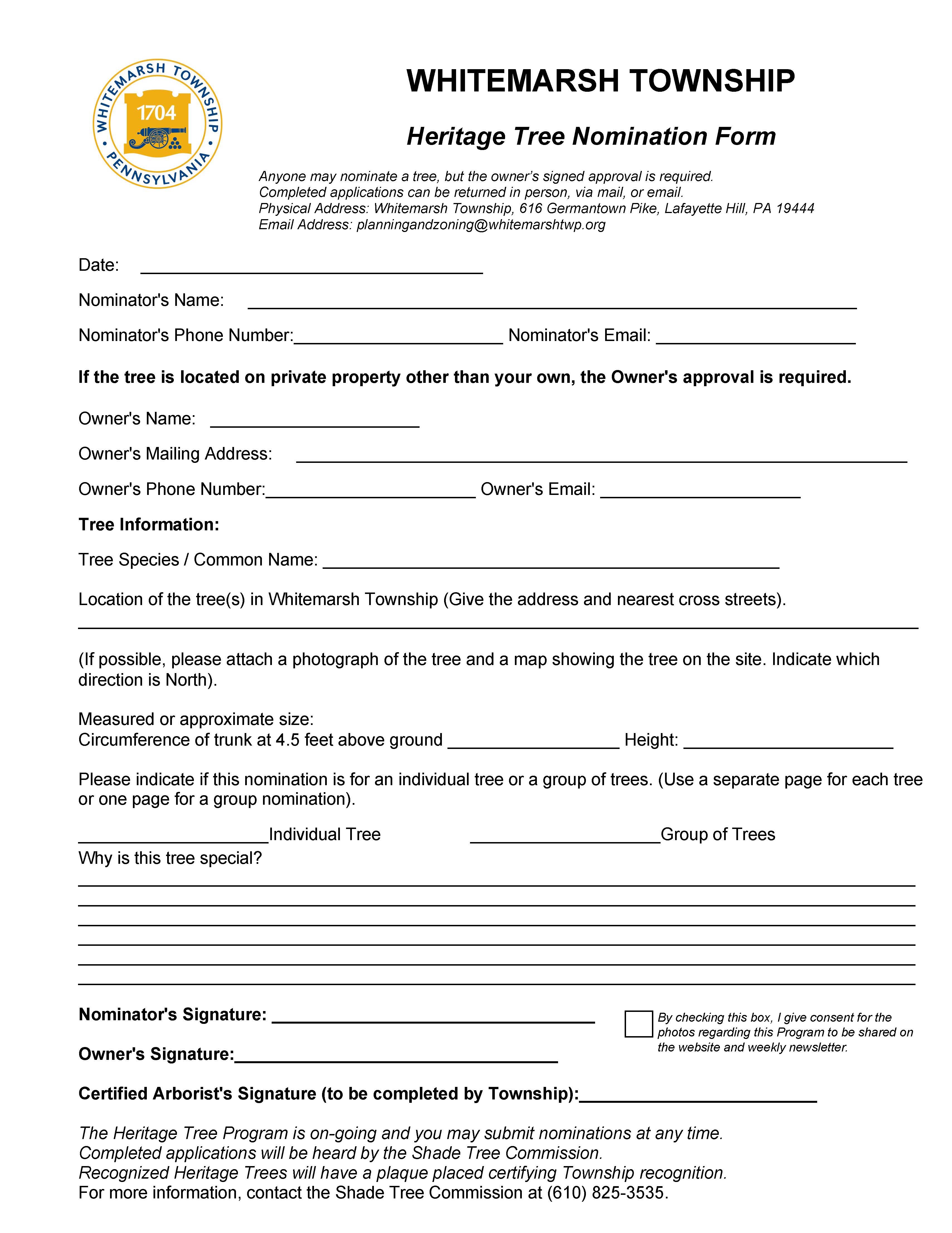 If this sounds like a tree you know, you can fill out the Heritage Tree Nomination Form and return it to the Township. Completed applications will be considered at a public Shade Tree Commission meeting. Successfully nominated trees will receive a recognition plaque to be planted beside the tree and photos may be published in the Whitemarsh Weekly and our website. This program is free of charge.