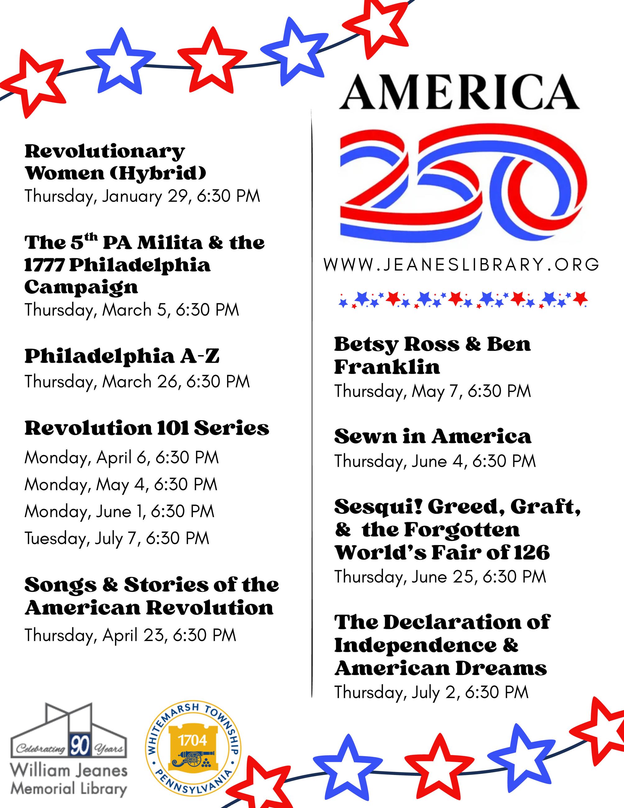 2026 marks America's 250th birthday! This page offers a comprehensive list of the countless events held in the Whitemarsh Township area, as well as state and national events and resources. These events range from connections to history, to focus on community and society through simple actions like beautifying our Township, or helping those in need!